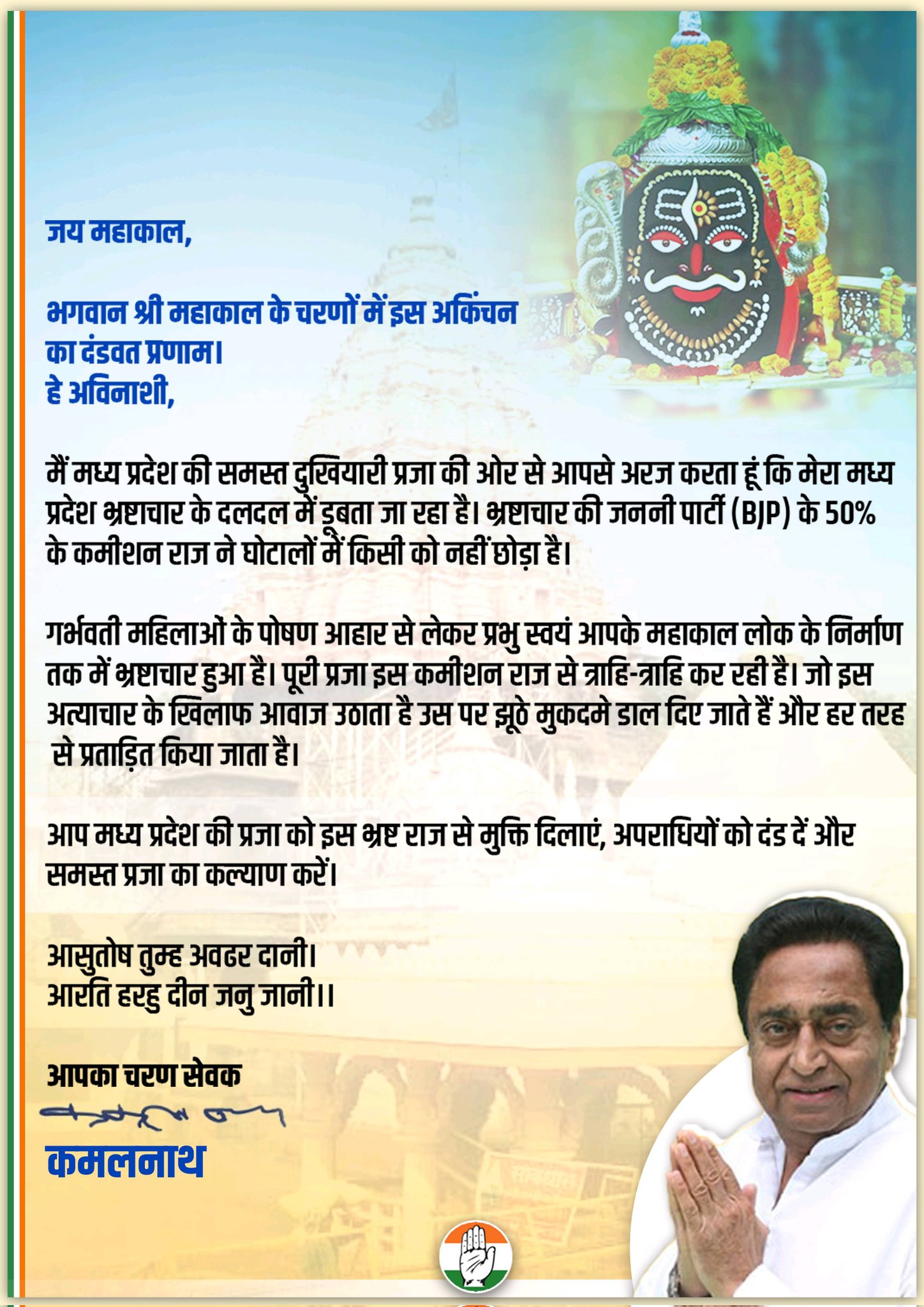 आप मध्य प्रदेश की प्रजा को इस भ्रष्ट राज से मुक्ति दिलाएं, अपराधियों को दंड दें और समस्त प्रजा का कल्याण करें।