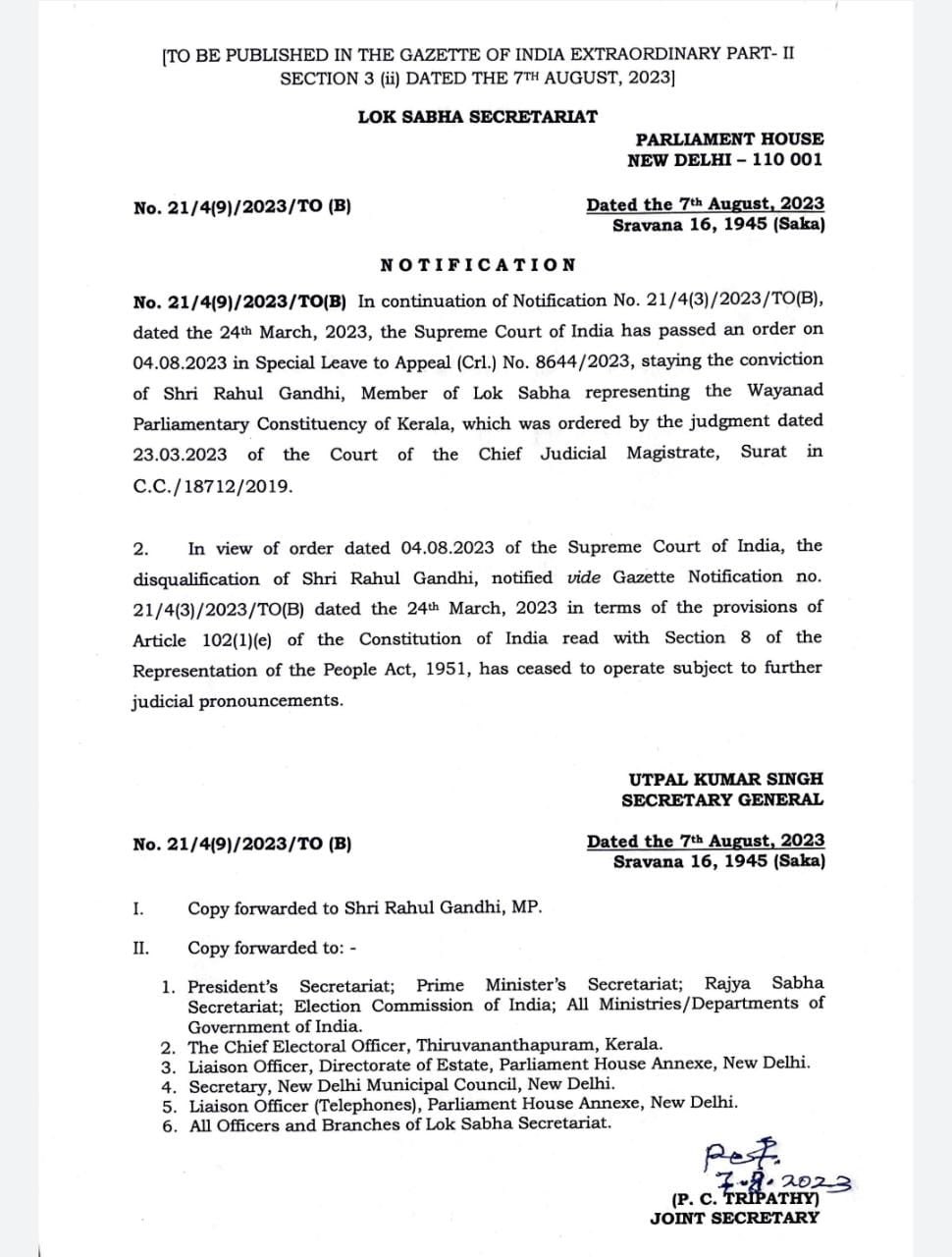 सर्वोच्च न्यायालय से स्थगन मिलने के बाद लोकसभा सचिवालय ने राहुल गांधी की सदस्यता को बहाल कर दिया है.